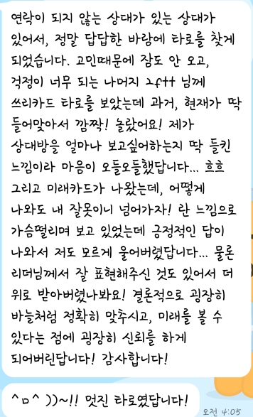 타로 커미션 후기 10 타입 : 3번 1회 걸린 시간 : 약 90분 질문 종류 : 관계점, 드림컾 질문 내용 : -드림컾의 관계에 관하여 신청자 후기 : 타로 커미션/후기 2020.06.21